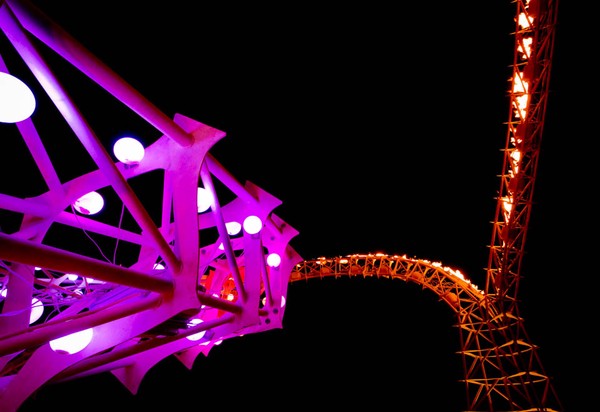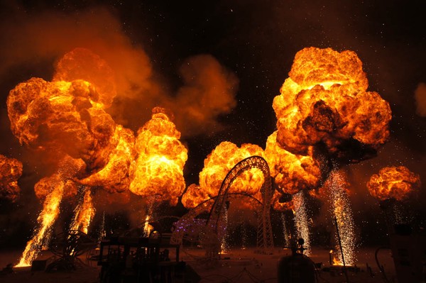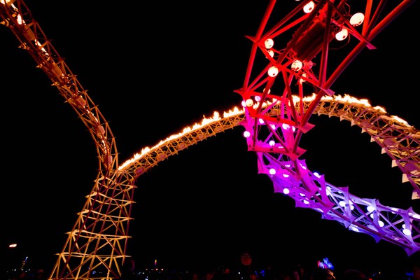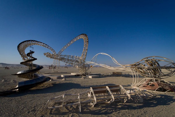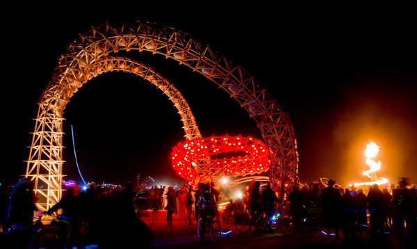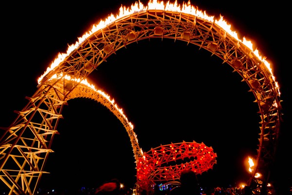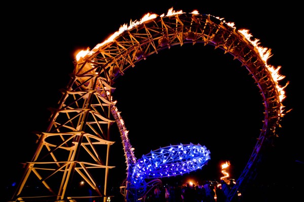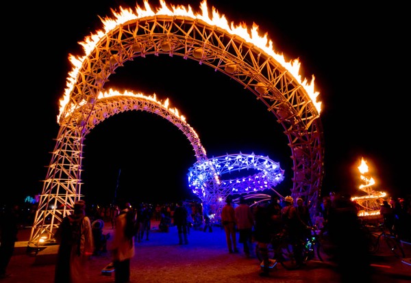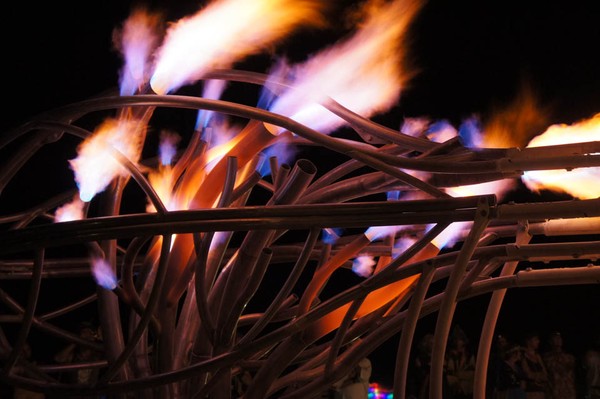 Tympani Lambada is a Burning Man 2011 Honorarium project by the Flaming Lotus Girls. The sculpture is comprised of two major trussed arches, a third cantilevered arch, sound-reactive benches and a spiral shaped methanol fountain with drip and shooter effects. The two large arches feature RS-485 controlled propane flame effects with fan-shaped diffusers capable of creating massive sheets of fire or sequenced bursts. The inner, cantilevered arch features spherical RGB LED pixels providing ambient lighting. The inner arch also features sequenced, computer-controlled “hammers” that sound against the structural steel of the sculpture. Lastly, the sculpture includes a propane/forced air effect which uses six 14A independently speed-controlled motors, fuel controls, and chemical powder injectors to creates rapid percussive noises, extreme temperatures, and bursts of colored flame.